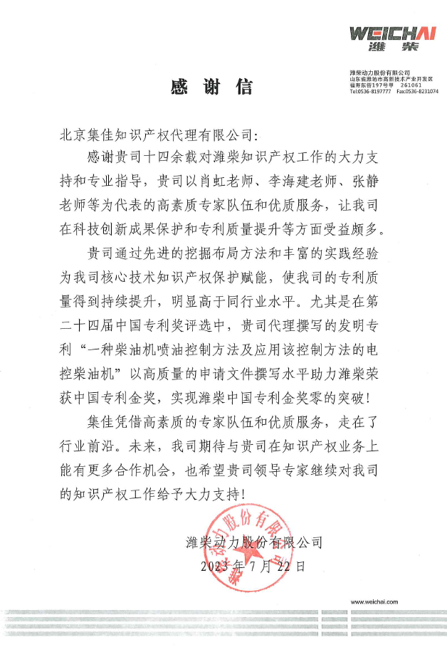近日,集佳收到客戶濰柴動力股份有限公司的感謝信,感謝集佳為濰柴動力撰寫的發(fā)明專利“一種柴油機噴油控制方法及應用該控制方法的電控柴油機”榮獲第二十四屆中國專利金獎,實現(xiàn)了濰柴中國專利金獎零的突破!