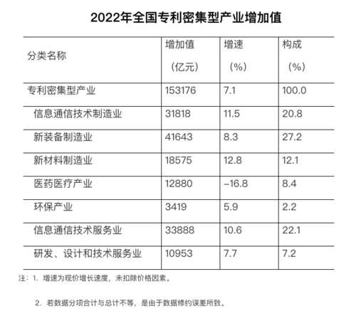 經(jīng)核算,2022年全國(guó)專(zhuān)利密集型產(chǎn)業(yè)增加值為153176億元,比上年增長(zhǎng)7.1%(未扣除價(jià)格因素,下同);占GDP的比重為12.71%,比上年提高0.27個(gè)百分點(diǎn)。