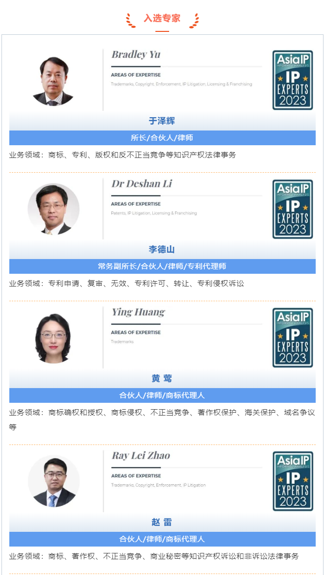 近日,國際權威知識產權媒體《亞洲知識產權》(Asia IP)發布了2023年度“中國知識產權專家百強榜”(Top 100 IP Experts in China),集佳于澤輝李德山黃鶯趙雷潘煒5位合伙人因其優質的專業服務及海內外業界與客戶的普遍認可榮登百強榜單!
