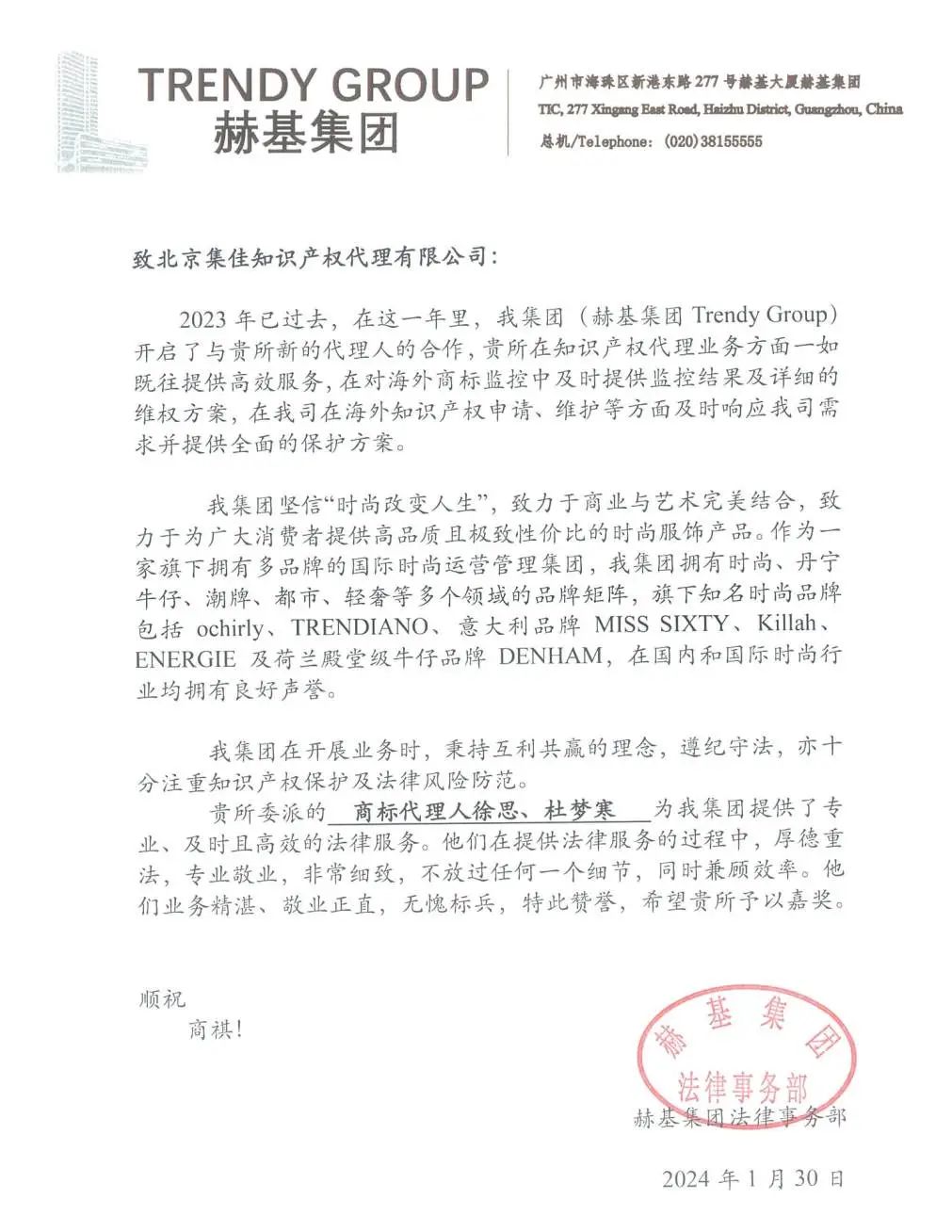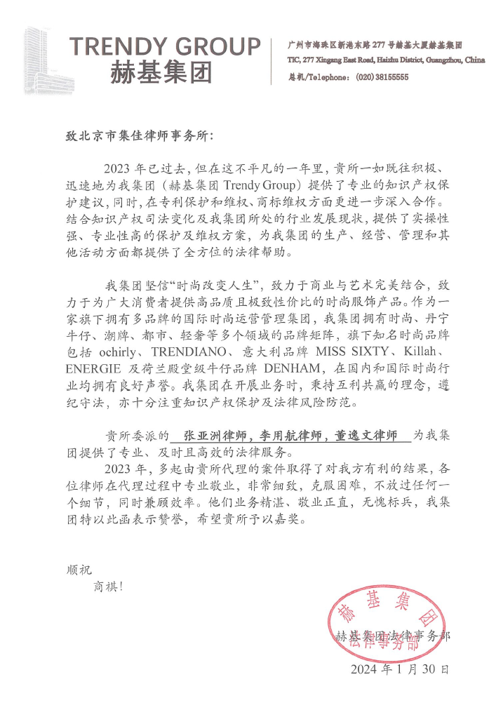 信中提到,2023年,集佳與赫基集團在專利保護和維權、商標維權方面更進一步加強合作,集佳一如既往、迅速地為赫基集團提供了專業的知識產權保護建議,集佳提供的實操性強、專業性高的保護及維權方案,為赫基集團的生產、經營、管理和其他活動方面都提供了全方位的法律幫助。赫基集團法務部贊揚集佳張亞洲律師李用航律師董逸文律師徐思律師、商標代理人杜夢寒等,在提供專業、及時且高效的法律服務的過程中,厚德重法,業務精湛,敬業正直,無愧標兵。