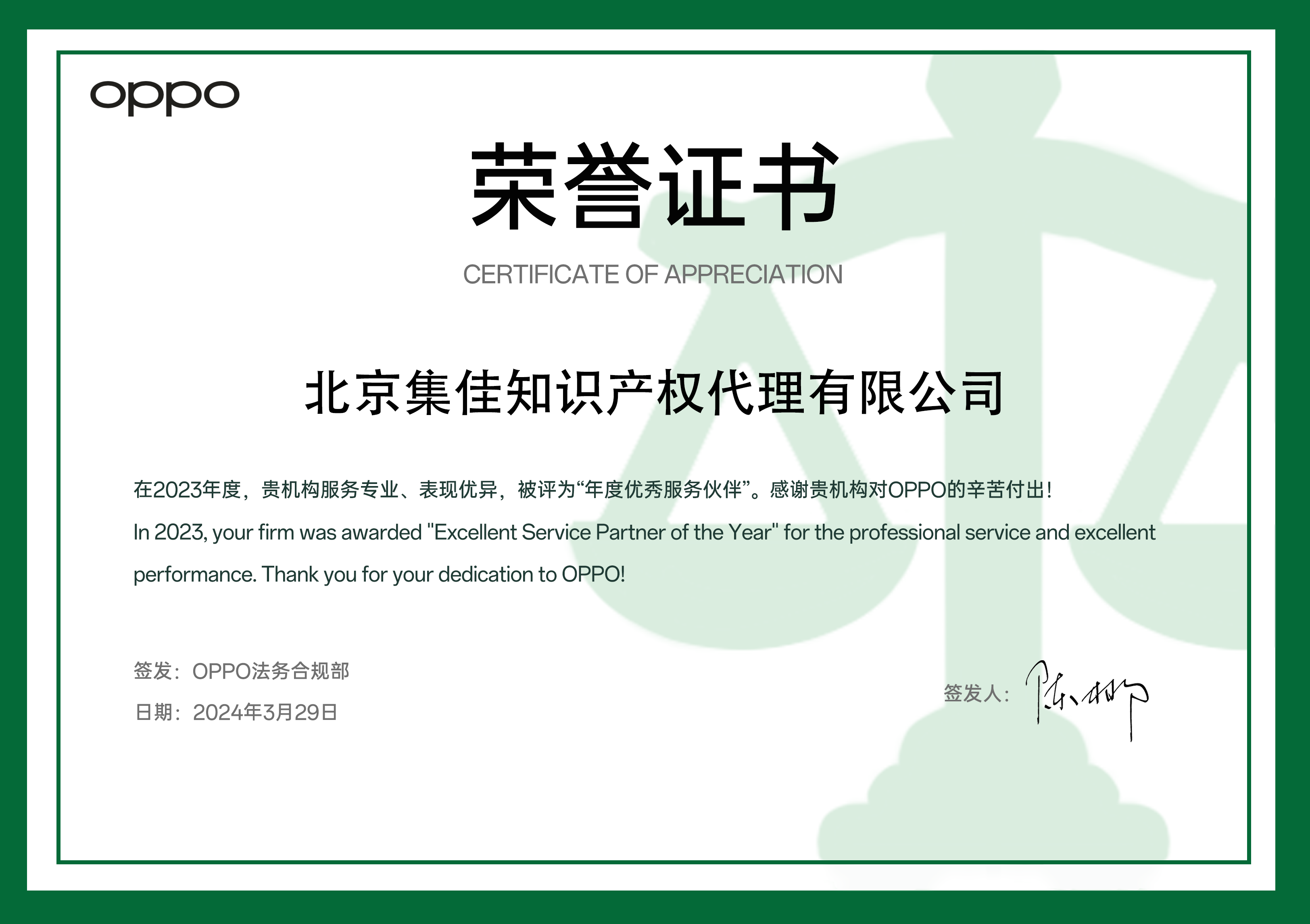 OPPO與集佳在知識產權領域已合作十余年,OPPO法務團隊在知識產權領域以專業性著稱,對于服務機構亦高標準嚴要求。OPPO法務合規部通過本次評選,對集佳及其優秀團隊在過去多年的合作中提供的高質量專業服務表示贊許與感謝,并期待未來繼續攜手合作,共同發展。