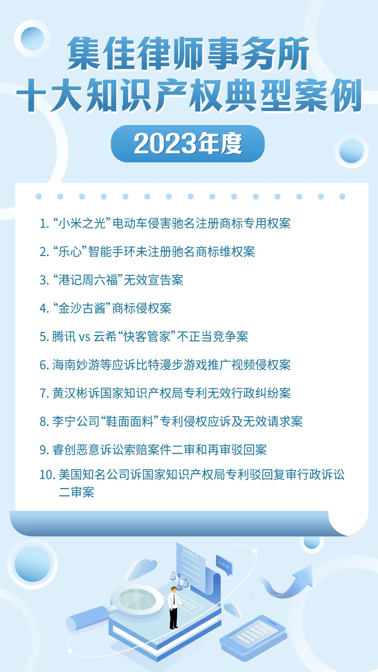 作為迎接4.26世界知識產(chǎn)權日的獻禮之一,北京市集佳律師事務所已連續(xù)十年開展十大知識產(chǎn)權典型案例的評選活動,其意義不僅在于展現(xiàn)集佳律師團隊的專業(yè)能力和水準,更在于傳遞集佳全方位服務客戶的理念。在第24個世界知識產(chǎn)權日來臨之際,集佳律所從2023年度代理的眾多知識產(chǎn)權案件中篩選出具有代表性的十大案例,與各界同仁分享: