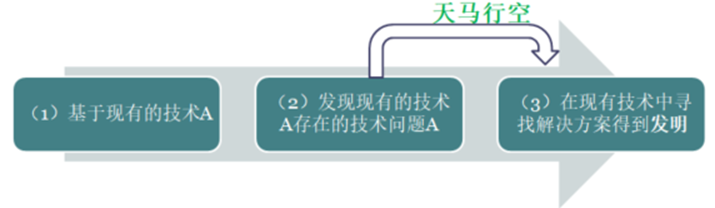 發(fā)明創(chuàng)造的實際產(chǎn)生過程通常可以模型化為:基于現(xiàn)有的技術(shù)A,發(fā)現(xiàn)技術(shù)A中存在的技術(shù)問題A’,技術(shù)人員隨機(jī)在現(xiàn)有技術(shù)中尋找可以解決該技術(shù)問題的現(xiàn)有技術(shù)手段,經(jīng)過實驗和驗證,最終得到可以解決該技術(shù)問題A’的技術(shù)方案,即發(fā)明創(chuàng)造本身。這個過程中,技術(shù)人員的思維是“天馬行空”式不受限制的。