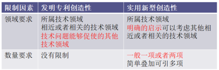 《專利審查指南》第四部分第六章第4節(jié)規(guī)定了實用新型專利創(chuàng)造性要求與發(fā)明專利有所不同,具體可以參見下表: