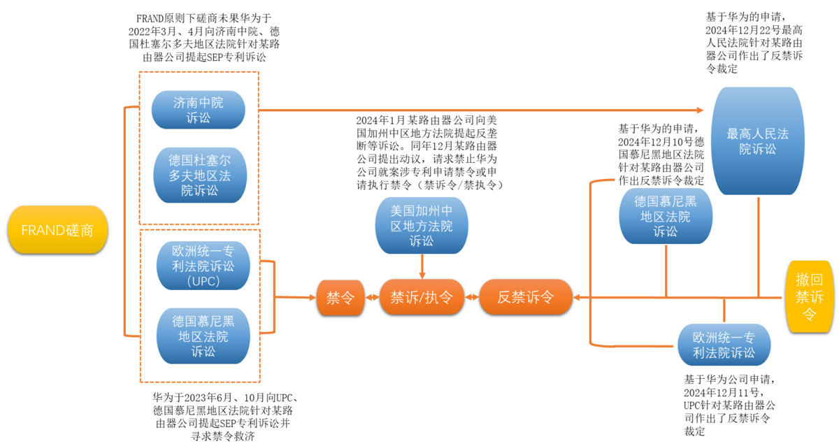 自2020年7月以來,華為公司基于FRAND原則表達了愿意與某路由器公司進行磋商就案涉專利在內的涉及Wi-Fi SEP專利達成許可并提供了許可費率,但某路由器公司未給予積極回應,最終雙方磋商陷入僵局。后,華為公司自2022年7月開始的兩年間針對某路由器公司分別向我國濟南中院、德國杜塞爾多夫地區法院、德國慕尼黑地區法院以及歐洲統一專利法院(UPC)分別提起專利侵權訴訟。2024年1月某路由器公司在美國加州中區地方法院針對華為公司提起反壟斷訴訟,訴稱華為公司涉嫌違反美國《謝爾曼法》,企圖非法壟斷Wi-Fi技術市場;且某路由器公司向華為公司表示其準備進一步向美國法院提起費率訴訟,請求裁決華為公司持有的Wi-Fi SEP專利的全球許可費率。
