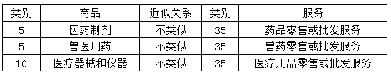 其次,在中國已經(jīng)接受的3509類似群的藥品、醫(yī)療用品零售或批發(fā)服務(wù),在與其他商品或服務(wù)的類似性判斷時(shí),根據(jù)《類似商品和服務(wù)區(qū)分表》的規(guī)定,其僅與歸屬于本類似群的服務(wù)構(gòu)成相同類似服務(wù),與該零售或批發(fā)服務(wù)所涉及的具體商品并不發(fā)生交叉檢索【4】。舉例如下: