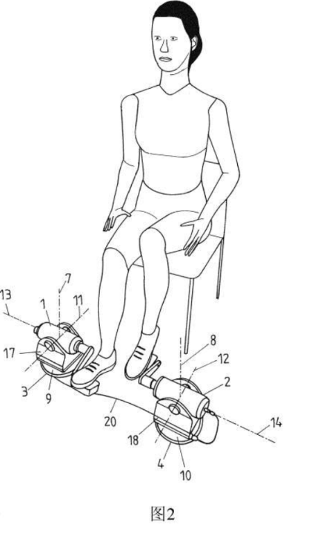 再者,對比文件3中完全沒有公開左右兩個曲柄軸42能夠單獨地通過中間元件來調節。對比文件3沒有公開各個曲柄軸對于待訓練的患者的相應的生理需求的單獨的可調節性。相反,對比文件3公開了用于患者的左腳和右腳的左右兩個曲柄軸的共同的調節方案。因此,對比文件3中沒有公開修改后的權利要求1中的“第一運動元件(1)設置在第一基礎元件(3)上,并且第二運動元件(2)設置在第二基礎元件(4)上,其中所述第一基礎元件(3)和所述第二基礎元件(4)在機械上完全彼此分開”。