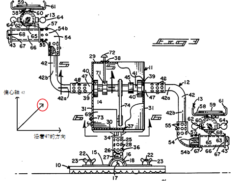 對比文件4僅僅公開了曲柄的轉動平面能夠圍繞通過銷57所限定的水平軸線來調整。然而,對比文件4中的曲柄不能夠被等同為案例中的“運動元件(17,18)”因為曲柄并非安裝在底板94上而是安裝在殼體90上。