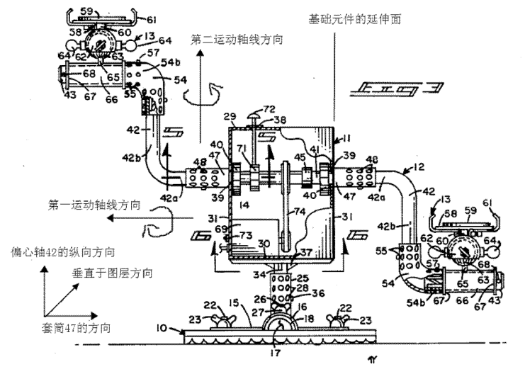 為此,代理人與審查員進行了電話溝通,溝通后更加佐證了代理人的判斷。審查員認為偏心軸42的縱向方向對應于案例的權利要求5和6中的“第二運動軸線”。這完全不符合事實。根據對比文件3的圖3,顯然,如果將管式緊固套筒47認為等同于案例中的第一運動軸線,那么垂直于圖層的方向(在附圖中的用紅圈標明的方向)才等同于案例中的第二運動軸線。然而,可以明確地從對比文件3的圖3中看到,沿著偏心軸42的方向(在圖層的平面中豎直的方向)完全不同于案例中的“第二運動軸線”。此外,顯然偏心軸42根本不可能圍繞垂直于圖層的方向旋轉。對比文件3完全沒有公開權利要求5和6中的技術特征。