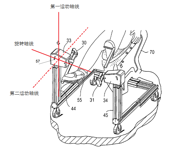 從對比文件4的圖5A中可見,審查員認為對比文件4中的沿著豎直方向的軸線等同于案例的權利要求1中的“第一運動軸線”,踏板55圍繞其轉動的轉動軸線等同于案例的權利要求1中的旋轉軸線,因此,通過銷57限定的軸線(以紅色虛線在圖5A中示出)等同于案例的權利要求1中的第二運動軸線。