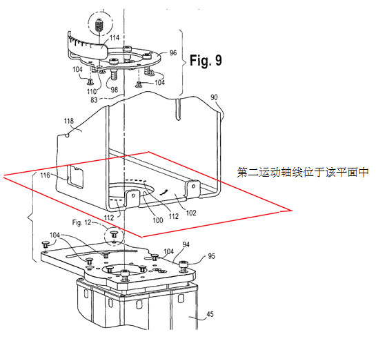 從對比文件4的圖9中可以看到,第二運動軸線位于紅色線框所示出的平面中。然而,螺釘98的肩部接合開口100的邊緣以將殼體90定位在該平面中。顯然,殼體90根本不可能圍繞該平面中的任何軸線轉動。也就是說,對比文件4并沒有公開案例的權利要求1中的技術特征“運動元件(1,2)能夠相對于相應的中間元件(17,18)彼此無關地圍繞第二運動軸線(11,12)運動”。