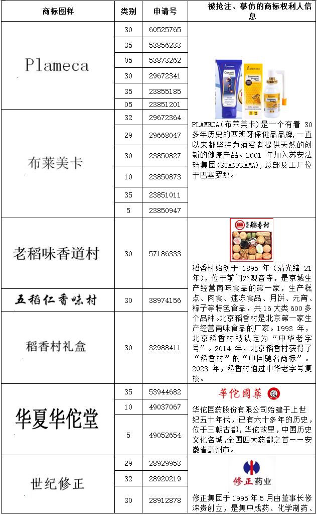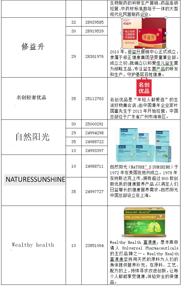 在分析系爭商標(biāo)申請人申請注冊商標(biāo)之時(shí),需要對其申請的商標(biāo)進(jìn)行逐一分析、比對,并闡述說明被搶注的商標(biāo)的真實(shí)權(quán)利人的情況,并提供參考證據(jù)。如第23851064號“WEALTHY HEALTH”商標(biāo)無效宣告案(系爭商標(biāo)申請人共申請156件商標(biāo))中,代理人發(fā)現(xiàn)該商標(biāo)申請人北京鑫鵬福元商貿(mào)有限公司申請的多件商標(biāo)與其他具有強(qiáng)顯著性和知名度的商標(biāo)相同或者近似,且被搶注的商標(biāo)的真實(shí)權(quán)利人根據(jù)查詢均可以一一對應(yīng)。通過列表,這些系爭商標(biāo)申請人搶注他人的情況可以很清晰的展示出來。