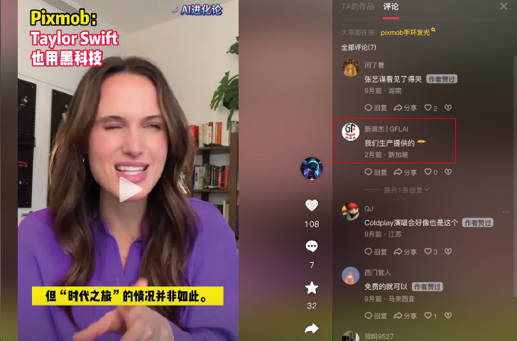 本案中,系爭商標(biāo)被系爭商標(biāo)申請人申請?jiān)诘?1類商品上,同時(shí)系爭商標(biāo)申請人同時(shí)也生產(chǎn)發(fā)光手環(huán)商品,與申請人處于同一商業(yè)領(lǐng)域。系爭商標(biāo)申請人僅申請了9枚商標(biāo),數(shù)量較少。在調(diào)查系爭商標(biāo)申請人行動之時(shí),代理人發(fā)現(xiàn)系爭商標(biāo)申請人的關(guān)聯(lián)公司在抖音社交媒體關(guān)于國際巨星、歌手Taylor Swift(泰勒斯威夫特)的演唱會上使用申請人的PIXMOB發(fā)光手環(huán)的視頻下面(見下圖),主動聲稱該手環(huán)為其公司生產(chǎn)制造。代理人立刻對該證據(jù)進(jìn)行了固定。
