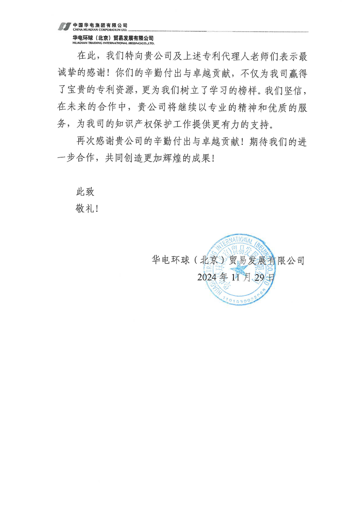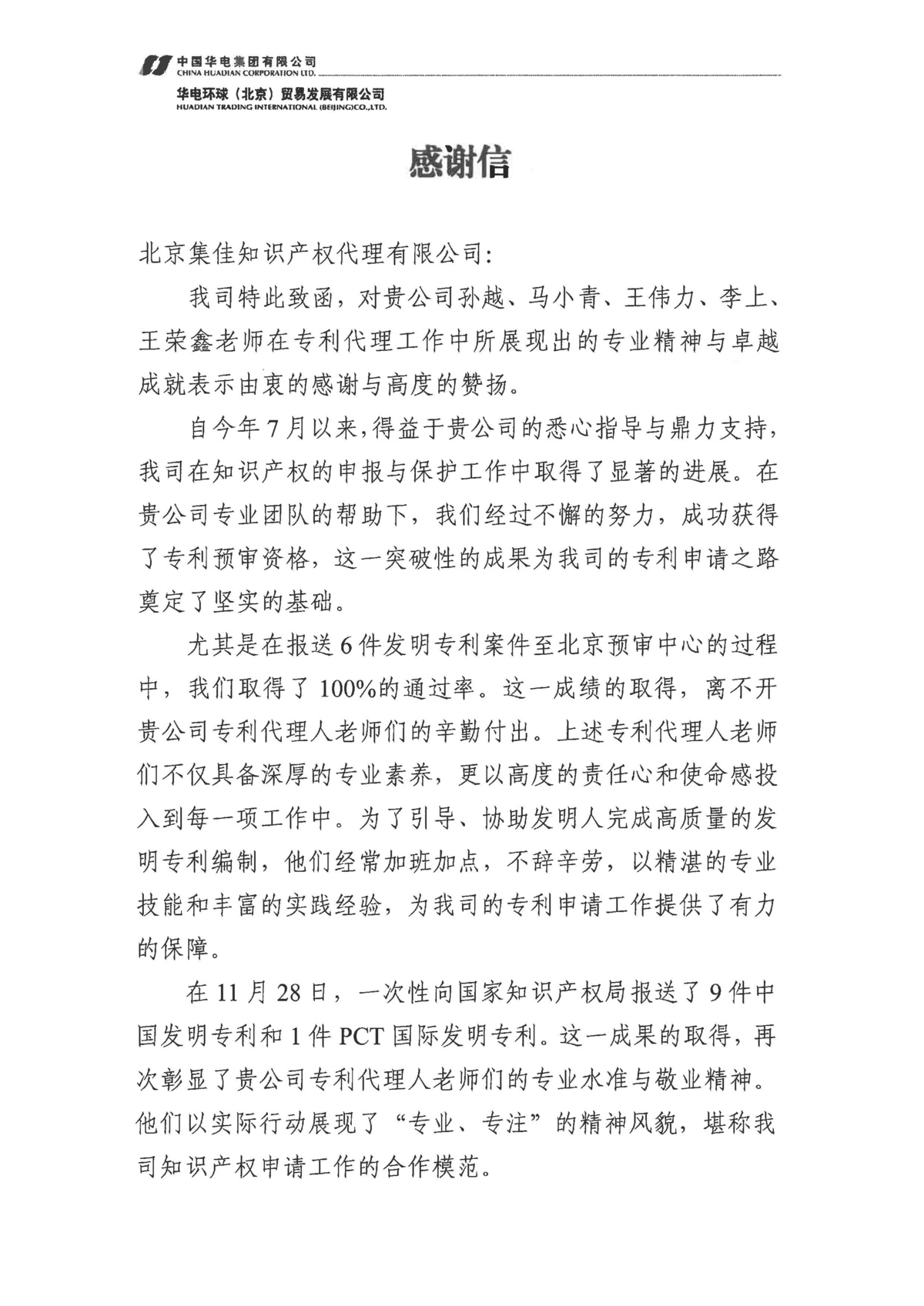 近日,集佳收到客戶華電環(huán)球(北京)貿(mào)易發(fā)展有限公司的感謝信,對集佳在知識產(chǎn)權(quán)申報與保護工作中給予的專業(yè)指導與大力支持表示由衷感謝,同時對集佳孫越、馬小青、王偉力、李上、王榮鑫等專業(yè)人員在專利代理工作中所展現(xiàn)出的專業(yè)精神與卓越成就表示高度贊揚!