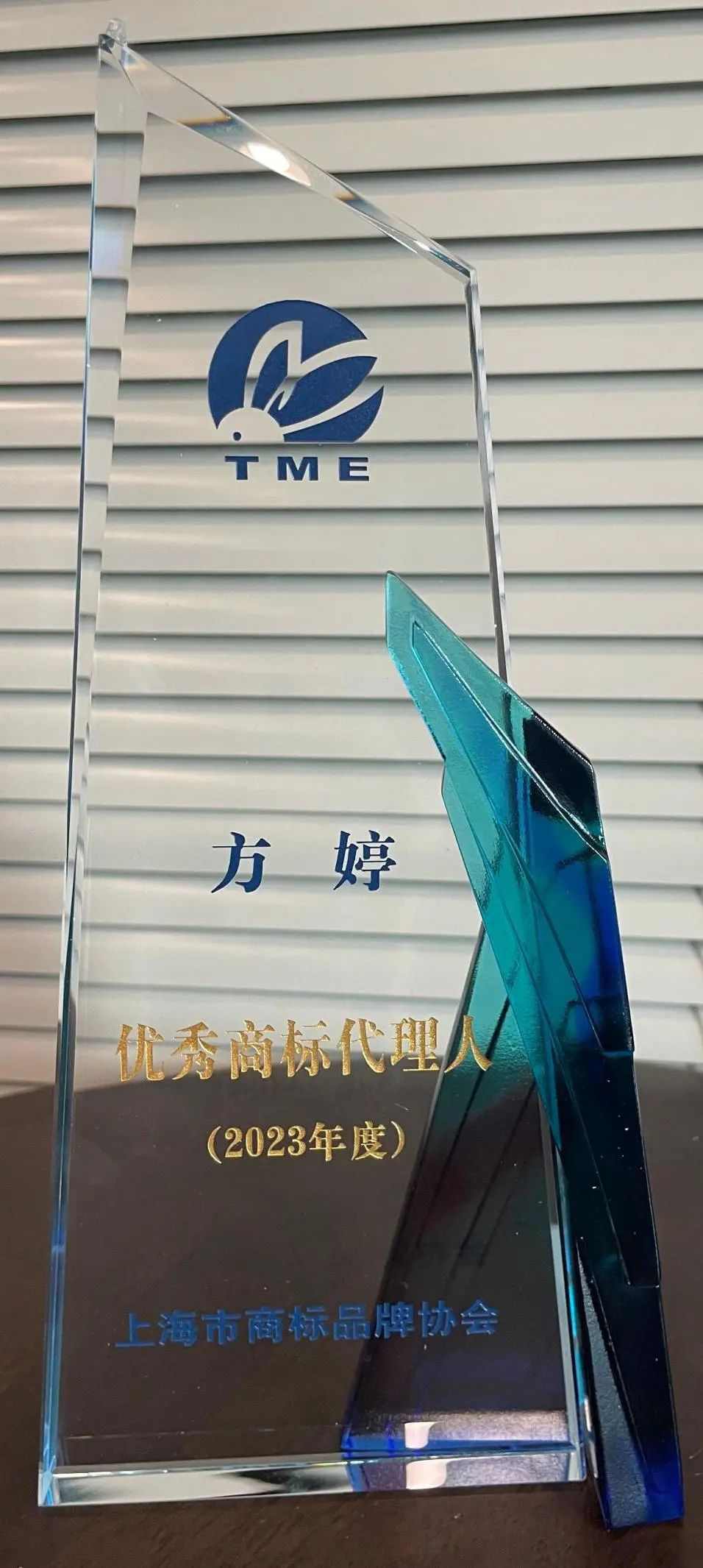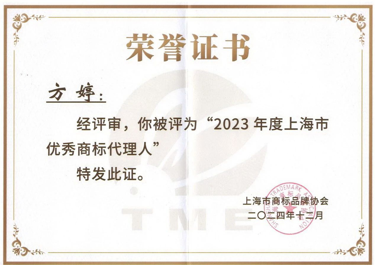 集佳上海分所方婷律師被評為2023年度“上海市優秀商標代理人”。
