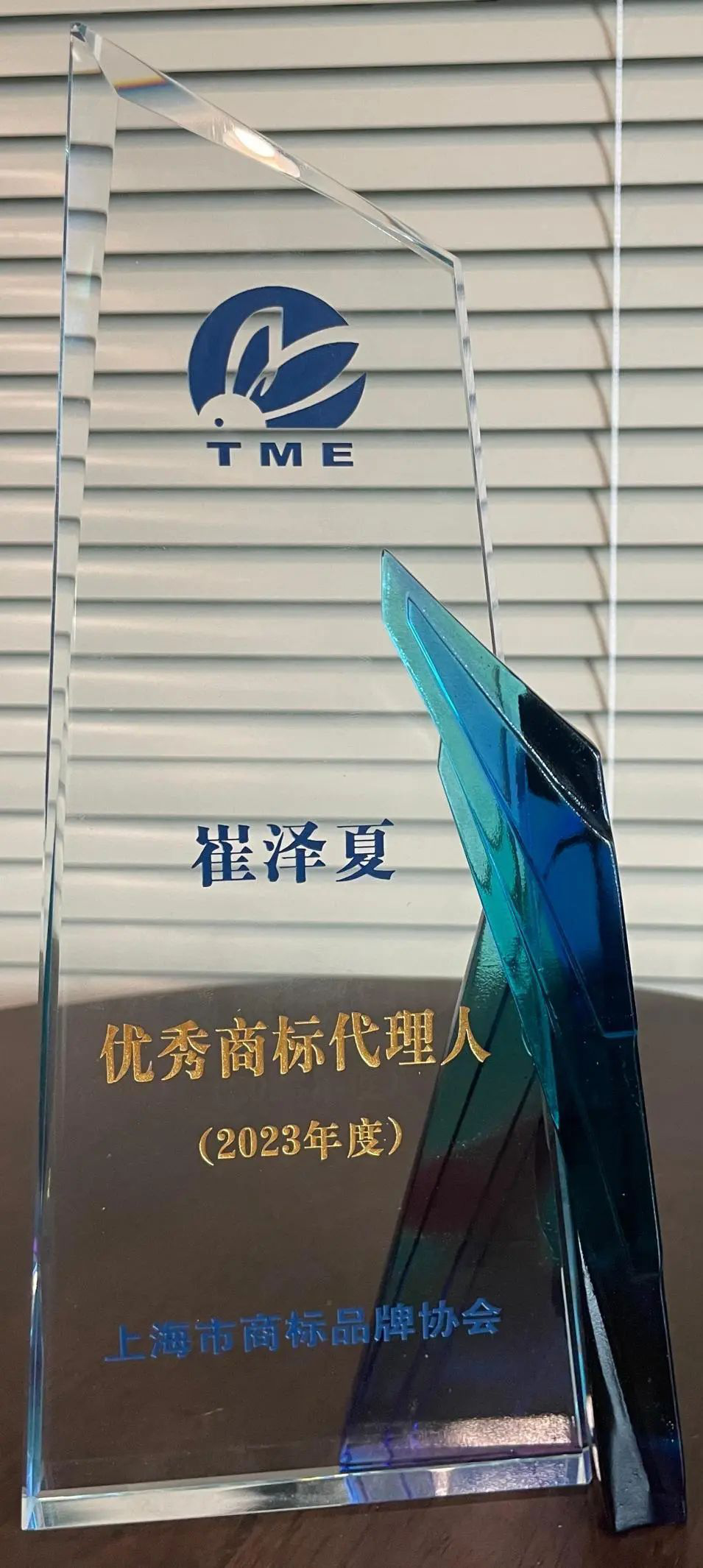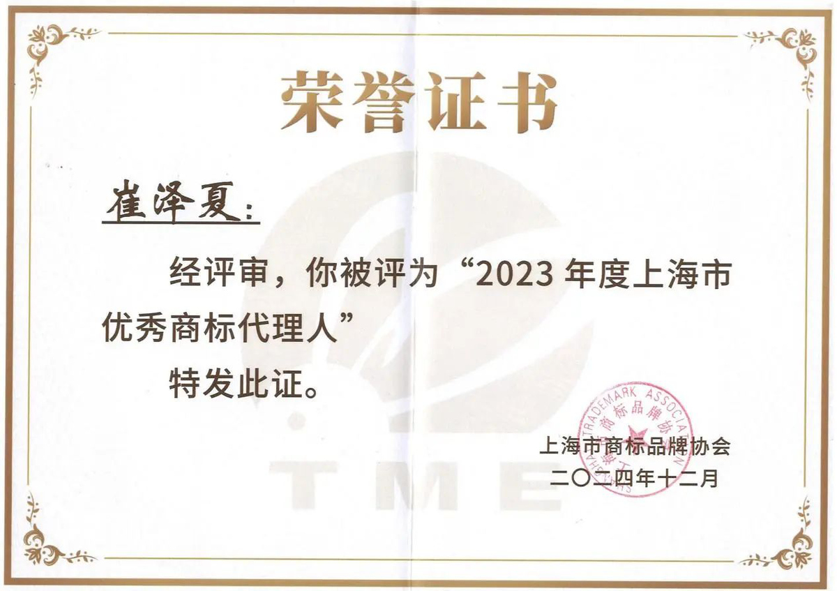 集佳上海分所崔澤夏律師被評為2023年度“上海市優秀商標代理人”。