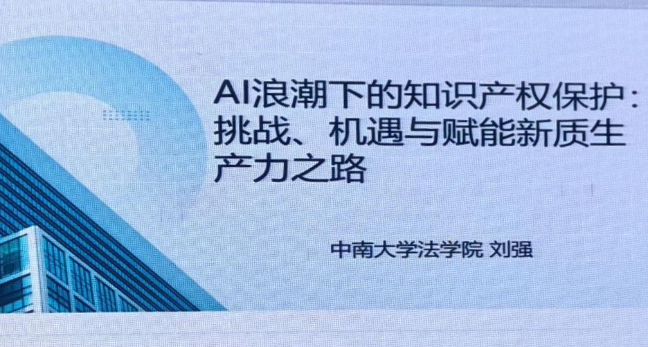 在專家培訓環節,中南大學法學院劉強教授帶來了一場精彩紛呈的專題分享。他以“AI浪潮下的知識產權保護:挑戰、機遇與賦能新質生產力之路”為題,深入剖析人工智能時代知識產權保護面臨的新課題,為與會者開拓了新視野,啟迪了新思路。